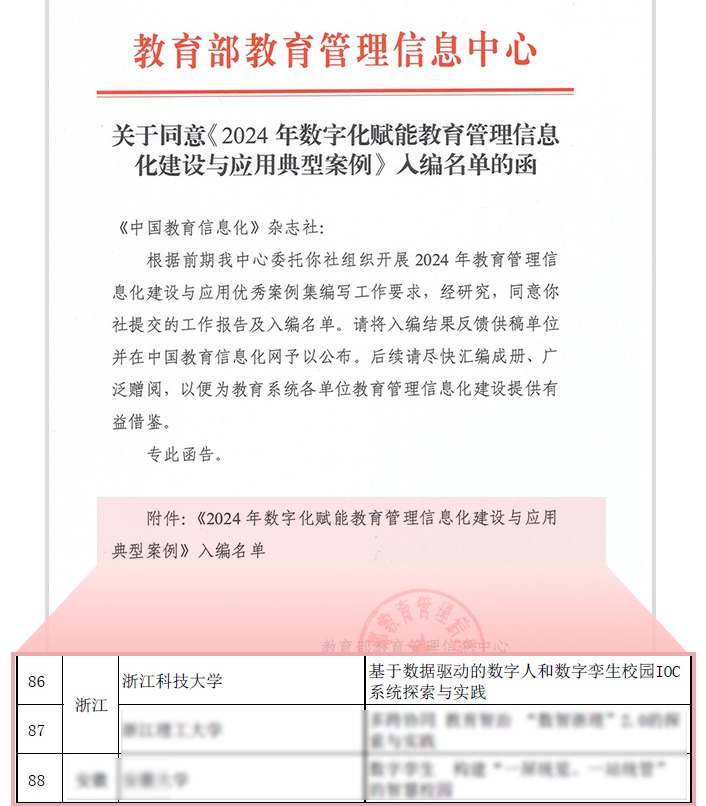 近日,教育部教育管理信息中心公布《2024年数字化赋能教育管理信息化建设与应用典型案例》入编名单,伟德官网申报的“基于数据驱动的数字人和数字孪生校园IOC系统探索与实践”入选。浙江省共2个本科高校典型案例入选,伟德官网是其中之一。