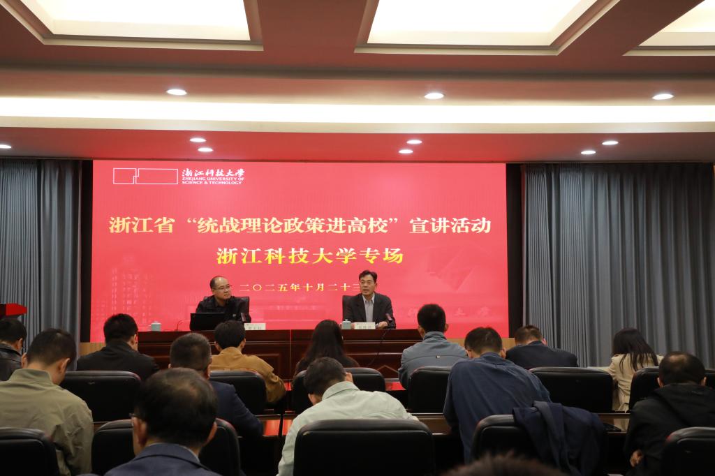 10月23日,浙江省“统战理论政策进高校”宣讲活动伟德国际1946bv官网专场举行,浙江省社会主义学院教授、“统战理论政策进高校”讲师团成员黄天柱作“落实统战工作责任制 完善大统战工作格局”专题宣讲。党委副书记、统战部部长单胜道主持。