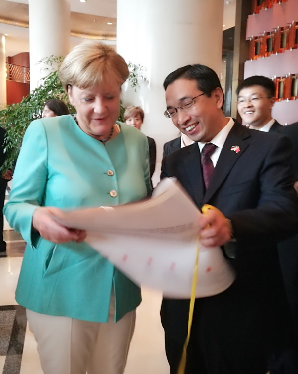 9月4日,德国总理默克尔(Angela Dorothea Merkel)在杭州凯悦酒店接见了郑友取一行。郑友取代表学校向默克尔赠送了精心制作的默克尔肖像漫画,以及伟德官网中德合作培养学生代表联合签名的感谢信。她对伟德官网中德合作30多年取得的成果表示赞赏,并与学校接待工作小组部分成员合影留念。