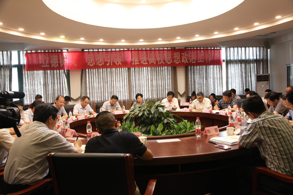 王建华代表学校党政班子和全体师生对葛部长一行来校视察表示欢迎和感谢。他从办学水平、办学空间、社会服务、事业发展、文化建设等五方面汇报了学校过去五年发展取得的主要成绩。他说,学校党委、行政一直以来十分重视思想政治工作。尤其是自2015年4月全省高校思想政治工作会议召开至今,学校紧紧坚持立德树人,不断强化政治意识、政权意识和阵地意识,牢牢把思想政治工作抓在手里,扛在肩上。