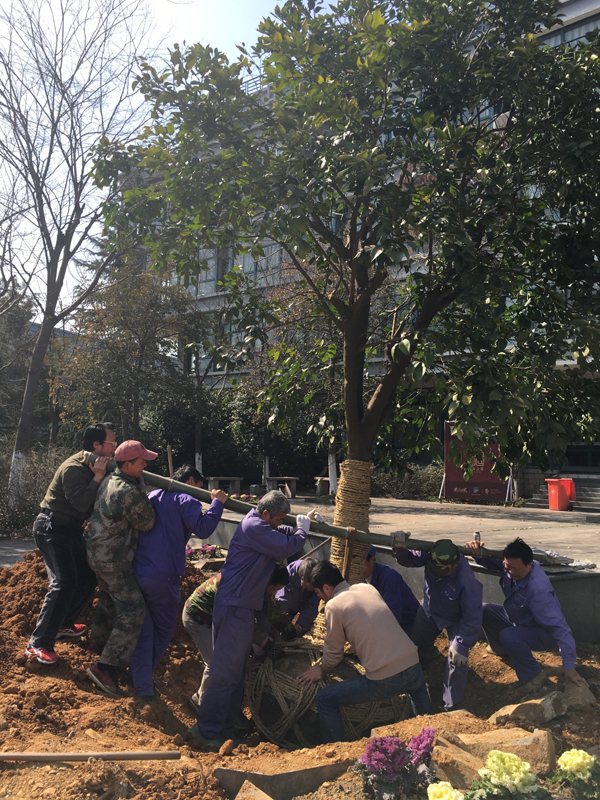 为做好春季植树造绿工作,后勤服务部和资产处利用寒假赴江苏、山东等地园林基地精心挑选树种,后勤物业部员工在植树前挖坑、铺土做足准备。