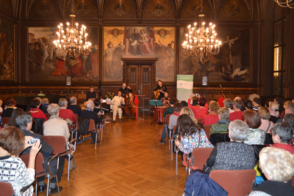 德国当地时间2月5日晚,埃尔富特孔院在当地市政厅大礼举办猴年新春音乐会,哥廷根著名音乐团队——中德联合世界音乐乐团(Chinermany)特邀前来演出,超过两百名来自埃尔福特及周边城市的市民到场参与了本次音乐会。