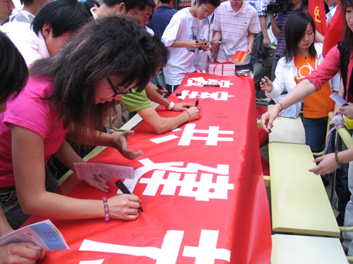 最后,在场的领导、老师及学生在“打造节约型公寓,创建和谐社区”的横幅上签名,党员之家“互助式服务站”也随即开展了各项服务。