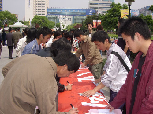 在武林广场的闭幕式上,伟德官网邓小平理论读书会和沁园环保社的同学以“以骄奢淫逸为耻”为切入点,通过发放市民“节电倡议书”、现场讲解等形式向广大市民宣传如何贯彻八荣八耻,构建节约型社会,受到了一致好评,不少市民还纷纷在构建节约型社会的横幅上签名。本次活动同时还吸引了浙江日报等多家媒体的采访报道。