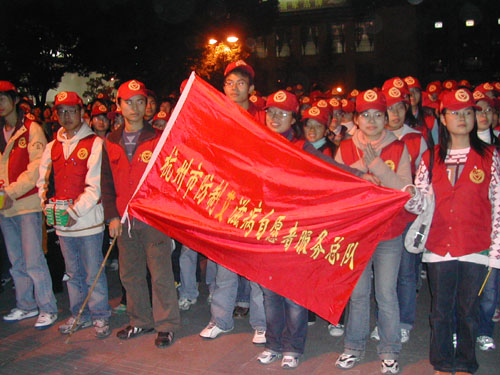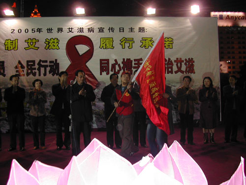 启动仪式上,全体人员都胸佩红丝带,默默悼念身边死于艾滋病的人们。杭州市卫生局局长做了爱滋病宣传报告,市委副书记叶明亲手将“杭州市防治艾滋病志愿者服务总队”的旗帜交到了志愿者代表的手上。