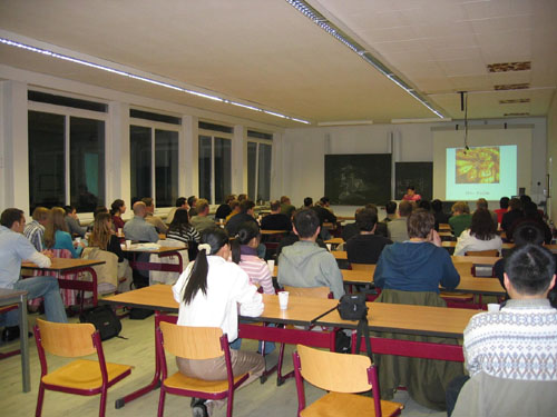 近日,伟德官网2002级机电系七名2+3留德新生在德国汉诺威应用科学大学面向全校师生成功地举办了《介绍中国》报告会。该报告会共分“现代中国”、“2008年北京奥运会”和“中国饮食文化”三个部分,历时两个多小时。汉诺威应用科学大学外办主任Blümel女士,机电系的部分教授以及约50位中外同学参加了这次报告会。
