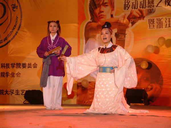 迎新晚会上,求是学院健美操队带来了动感十足的《如火的青春》,它象火焰一般点燃了全场所有人的热情。刚刚毕业的校友、“闪亮之星”胡云哲回到母校特别为同学们送上一曲《十年》,依旧引得台下师弟师妹的尖叫欢呼。独唱、舞蹈、话剧、小品、越剧、古筝独奏……师生们用多种多样的艺术形式和青春的热情演绎多姿多彩的校园生活,欢迎2004级新生的到来。晚会还在节目表演中间穿插了问答、游戏与抽奖活动,让台下的观众也不断融入晚会热烈的气氛。年青人奔放的热情在小和山略带寒意的夜晚尽情释放。最后,晚会在极具感染力的《今夜无眠》的歌声中缓缓结束。