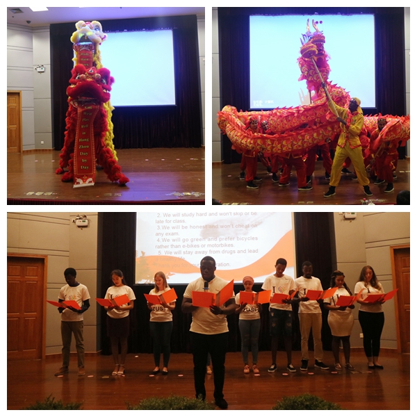 精彩的留学生舞龙舞狮秀,炫酷的街舞和优美的中文歌曲表演拉开典礼的序幕。老生代表用流利的中文讲述自己的学习经历,表达对学校的感谢,并向新同学提出有益的建议。新生代表在发言中表达对崭新大学生活的期待和向往。