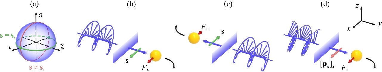 近几年学界在垂直于动量方向的横向光力的发现为光学微操控技术的应用拓展了新的维度,为了清晰阐明横向光力的物理机制,研究团队基于光力的多极展开法研究发现:(1)任意尺寸球粒在倏逝场中所受光力与四类电磁场量有关,即:能量密度梯度∇w、轨道动量po、Belinfante自旋动量ps以及自旋角动量s。其中,前两类场量∇w和po分别诱导梯度力和辐射压力,与横向x无关。后两类场量ps和s诱导横向光力Fx。(2)当倏逝场的自旋s满足自旋动量锁定条件时,横向Belinfante自旋动量为零,从而横向光力仅正比于横向自旋,如图(b)和(c)所示。(3)当倏逝场自旋s同时包含横向自旋和纵向自旋时,此时横向光力正比于横向Belinfante自旋动量,如图(d)所示。