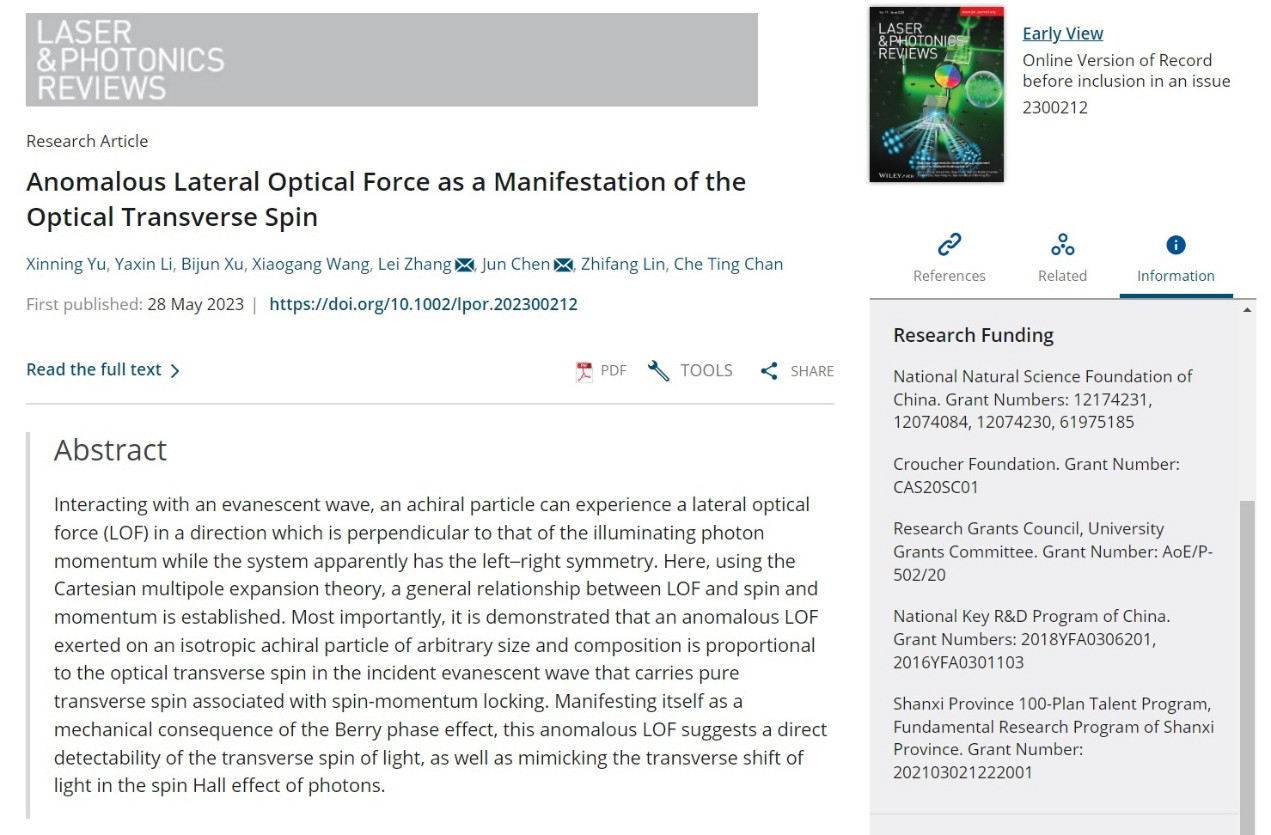 近日,光子与光场调控研究团队在“倏逝场的横向光力”领域取得重要进展,研究成果以浙江科技学院为第一单位在国际权威期刊《Laser & Photonics Reviews》在线发表了题为《Anomalous lateral optical force as a manifestation of the optical transverse spin》的论文(点击阅读)。理学院教师俞昕宁为该论文的第一作者,徐弼军教授和汪小刚教授分别为论文的共同作者。该研究得到了国家自然科学基金、国家重点研发计划、香港AoE项目等的支持。