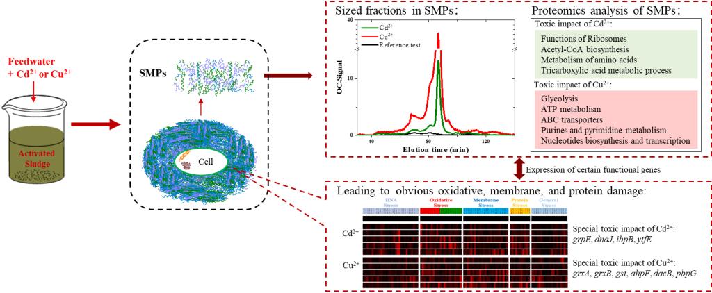 活性污泥法污水处理技术是目前应用最广泛的污水处理技术之一。重金属离子会显著影响活性污泥系统中微生物分泌溶解性代谢产物的分子组成及其含量,进而改变污水处理的出水水质,但其作用机制尚有待进一步揭示。伟德官网净水控碳团队研究对比了二价镉离子(Cd2+)和二价铜离子(Cu2+)两种重金属离子影响微生物分泌溶解性代谢产物过程的分子生物学机制差异,发现Cd2+可使细胞内氨基酸代谢相关蛋白的表达上调,继而改变底物在代谢通路中的生化反应方向,致使代谢产物中各分子量有机物含量都上升,而Cu2+则可改变细胞中核糖核苷酸、嘌呤和嘧啶有关代谢活动的蛋白表达水平,影响遗传信息的转录、信号传递等生化反应过程,促进微生物分泌更多的中间代谢产物。这一研究成果为污水生物处理过程的运行与优化提供了有益参考。