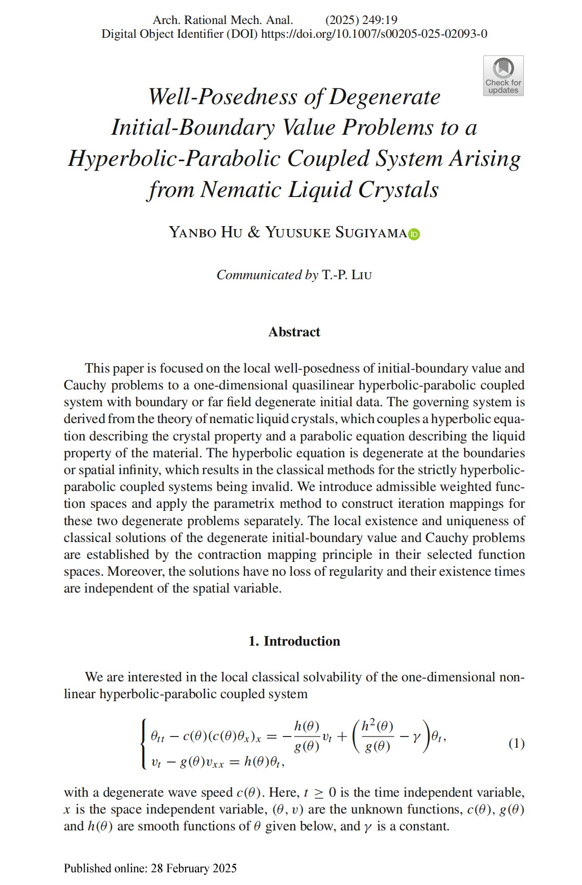 近日,非线性偏微分方程团队胡燕波教授与日本滋贺县立大学Yuusuke Sugiyama教授合作,在《Archive for Rational Mechanics and Analysis》(理性力学与分析档案,简称ARMA)上发表长达66页的论文。这篇题为“Well-Posedness of degenerate initial-boundary value problems to a hyperbolic-parabolic coupled system arising from nematic liquid crystals”(点击阅读)的研究论文,理学院胡燕波教授为第一作者,伟德国际1946bv官网为第一完成单位。