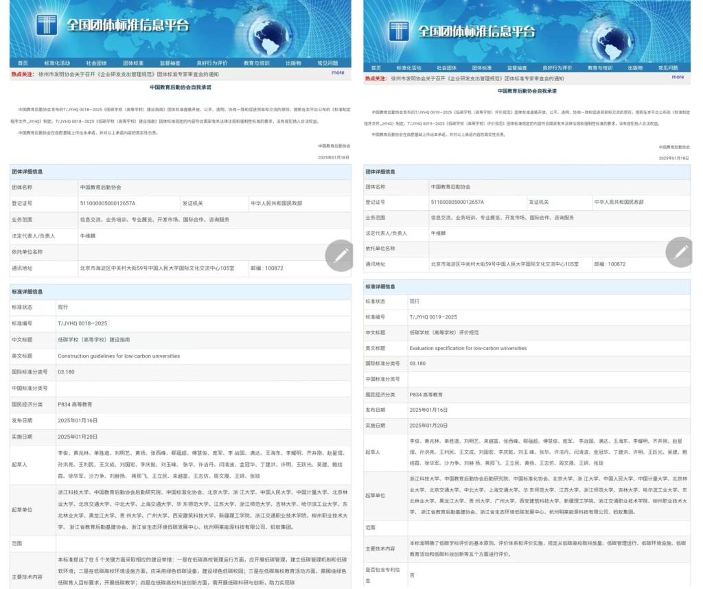 1月16日,经中国教育后勤协会批准,伟德官网环资学院牵头编制的《低碳学校(高等学校)建设指南》(T/JYHQ 0018—2025)与《低碳学校(高等学校)评价规范》(T/JYHQ 0019—2025)团体标准正式发布,两项标准于2025年1月正式实施,填补了现行相关标准的空白。