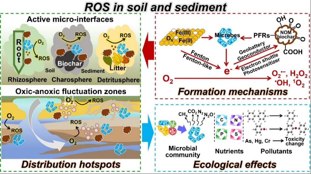 文中总结了当前先进的活性氧(Reactive Oxygen Species,ROS)检测方法,界定了ROS在土壤和沉积物中的分布热区为活性微界面与氧化还原波动区,继而概述了天然有机质(NOM)、生物炭、过渡金属及微生物生成ROS的过程及机制,探讨了ROS对微生物群落、养分循环及污染物转化的影响,最后提出了发展ROS原位检测技术、解析痕量组分交互机制及推动ROS在土壤污染修复中的实际应用等未来研究方向,为绿色低碳发展原则下土壤固碳与污染修复提供科学依据。研究聚焦于传统活性氧(ROS)研究的局限性。既往综述多强调ROS的毒性和芬顿化学机制,缺乏对土壤/沉积物中ROS空间分布规律、多组分协同形成机制及生态效应的系统性整合。ROS(如超氧自由基O₂•⁻、过氧化氢H₂O₂、羟基自由基•OH和单线态氧¹O₂)作为环境中的关键活性组分,通过驱动碳氮循环、污染物转化和微生物群落演替深刻影响生态系统功能。然而,其分布异质性(如根际、炭际等微界面)和动态生成机制尚未明晰,制约了土壤碳封存与自然修复潜力的挖掘。本研究开创性揭示ROS分布热点与多组分协同机制,确立ROS在环境过程中的枢纽地位,为理解“活性氧-环境因子-生态功能”互作网络提供全新范式。