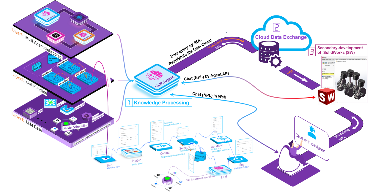 论文针对CAD机械设计系统智能化发展缓慢、以及大型语言模型固有的黑盒属性及其在领域知识严重的幻觉问题,开发了一种全新的AI-AD(Artificial Intelligence-Aided Design)智能机械设计系统。该系统遵循“从理解到生成”的设计理念,融合计算、感知和认知等多种智能技术,以大语言模型作为智能基座,整合知识处理、云数据交换以及SolidWorks的二次开发等组件和模块,根据用户输入的自然语言描述的设计需求,AI-AD系统即可自动完成相应的设计、参数优化以及3D模型的输出,最大程度降低了CAD机械设计的用户门槛,打破了CAD机械设计系统的智能化发展瓶颈,是全球首款 “从用户自然语言需求到模型生成的全流程智能设计”的突破性产品。