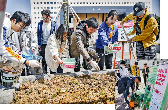 活动现场,生活老师向同学们介绍厨余有机肥制作过程及变废为宝用于校园绿化养护成效;同学们分工合作,挥锤松土、播撒花籽、施厨余有机肥,体验劳动最美,同时把“变废为宝”的绿色理念植入每个人心中。机械学院大类1810刘培锐同学:“很特别的一次体验,第一次知道剩饭剩菜可以经过处理变成一袋袋的肥料,而且还有机无污染,感觉特环保”。英语181董添添同学说:“我喜欢大自然,今天播了种子、施了肥料,期待他们早日开花”。