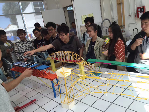 图1、2:赴法游学学生实地参观建筑工地、参加纸桥梁专业竞赛