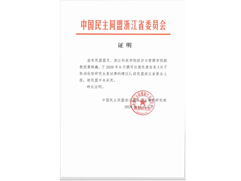 近日,伟德官网民盟盟员、经济与管理学院葛晓巍老师撰写的社情民意信息《关于取消收取研究生复试费的建议》,被民盟中央采用。