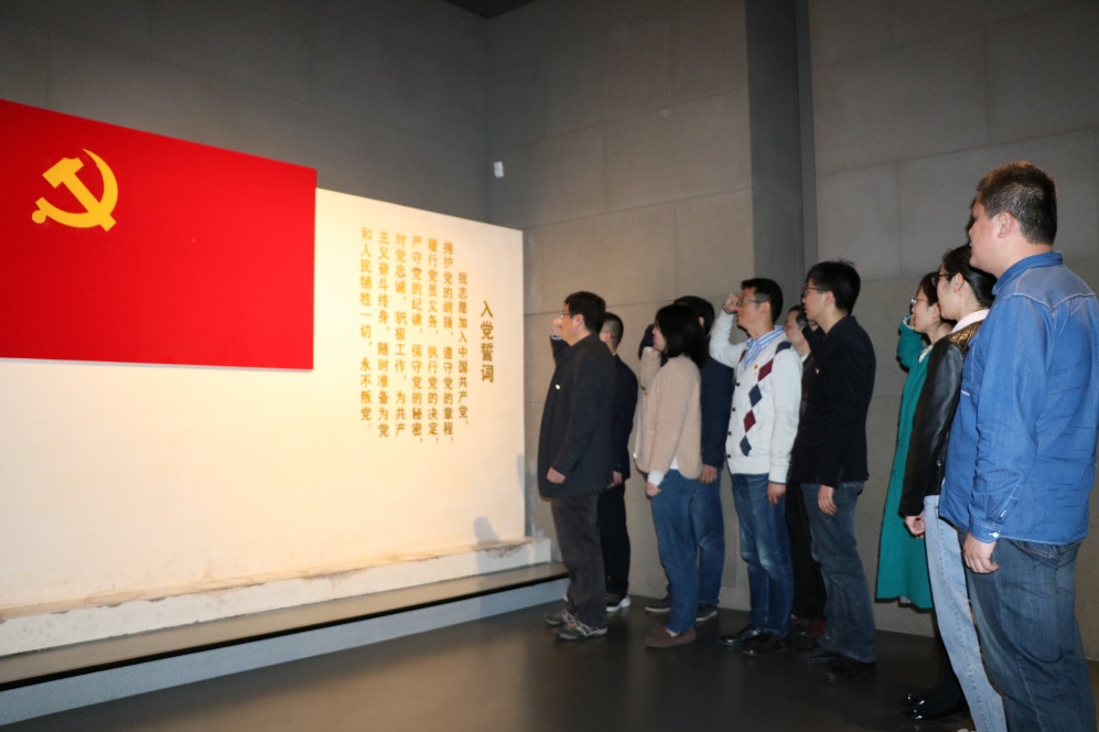 在到纪念馆党员宣誓墙,面对党旗,学院党委书记侯北平带领大家一起重温入党誓词。誓言铮铮,表达了对党的忠诚热爱和为共产主义事业奋斗终身的决心,坚定了不忘初心再出发,牢记使命勇担当的信心和决心。