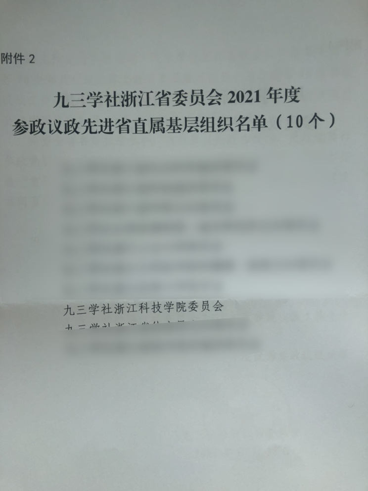 近日,从九三学社浙江省委获悉,九三学社浙江科技学院委员会获九三学社浙江省委2021年度参政议政先进直属基层组织,社员、艺术学院黄志青获2021年度优秀社务工作者,社员、电气学院王子辉获2021年度社会服务先进个人,社员、生化学院邸婧获2021年度优秀社员。