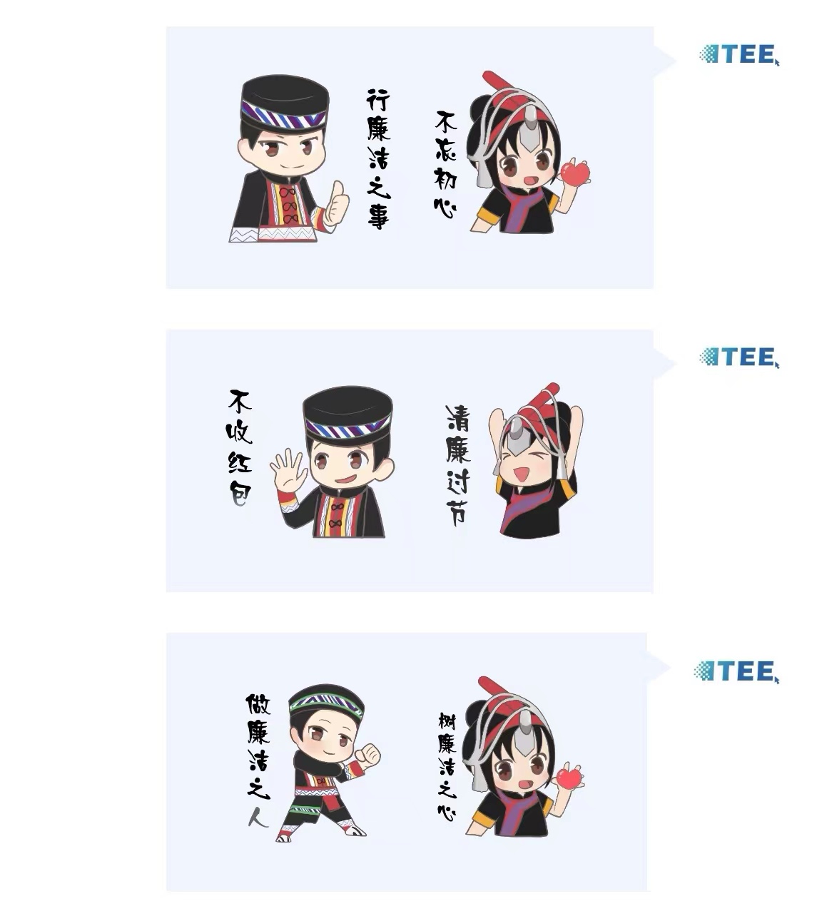 学院积极响应学校纪委发起的清廉主题表情包设计大赛,将廉洁文化建设向学生党员群体延伸,采用贴近校园、贴近学生生活的廉洁教育方式,指导数字媒体技术专业学生制作了一套富有畲族特色的廉洁表情包“畲族儿女说廉洁”,于端午佳节前夕推出,创新了节日廉洁提醒形式。