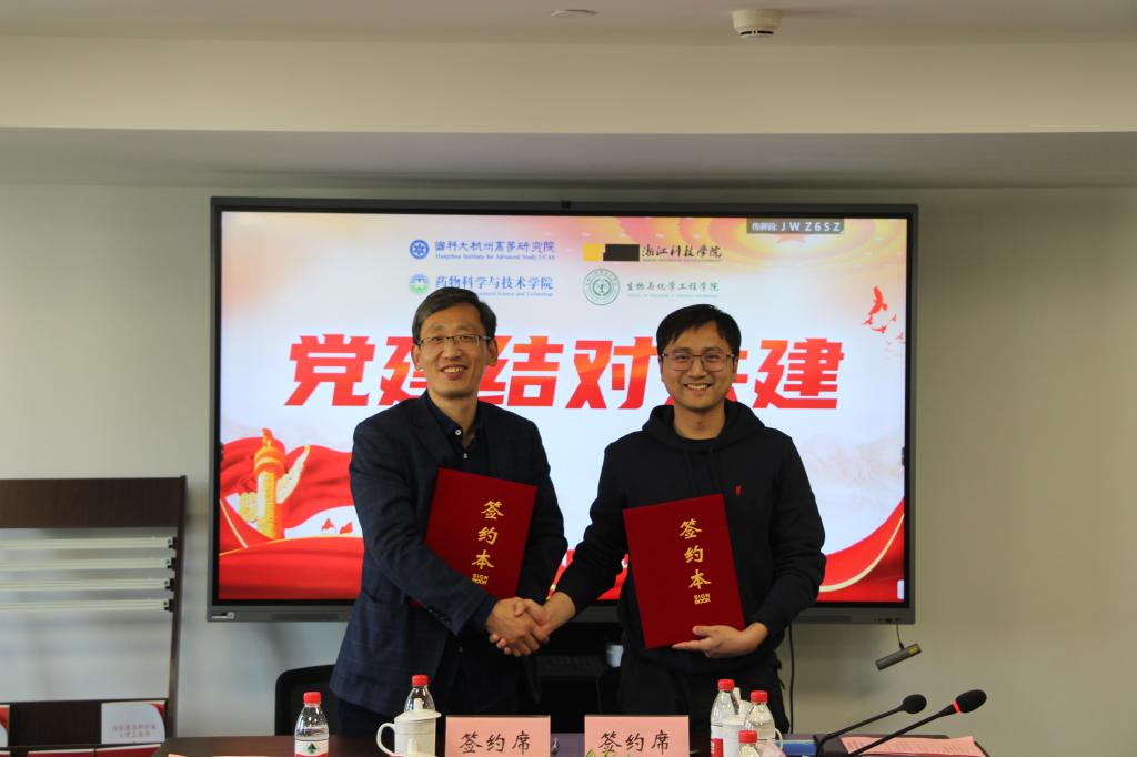 制药系教工支部副书记代表杭高院药学院党总支与生化学院党委签订党建联建协议,杭高院药学院教工党支部与生化学院制药系教党支部签订党建联建协议,双方就主题党日活动、三会一课等联办等开展了交流。(生化学院 付阳)