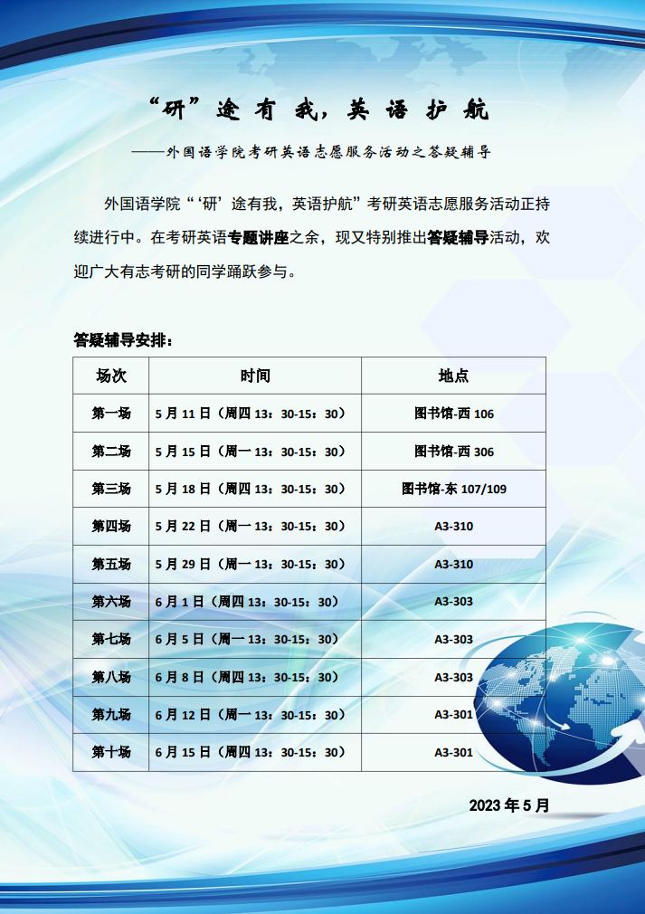 据悉,考研英语答疑辅导服务活动是外国语学院想学生之所想、响应呼声所推出的又一助考举措,是学院教师积极践行“我为师生办实事”又一生动体现,作为正在持续开展的考研英语专题讲座的有益补充,二者共同构成学院“‘研’途有我,英语护航”考研英语志愿服务活动的主要形式,本轮答疑辅导服务活动将在图书馆考研自习室、外国语学院考研辅导室等场所轮流举行(详见下表),方便备考学生前来咨询交流。希望通过答疑辅导提高伟德官网考生的英语成绩,助力更多学生考研圆梦。(外国语学院 石教旺)