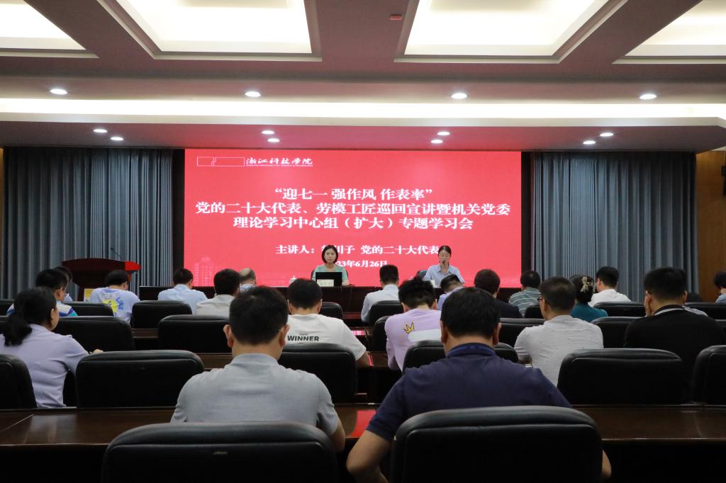 6月26日,机关党委举行“迎七一 强作风 作表率”党的二十大代表、劳模工匠巡回宣讲暨机关党委理论学习中心组(扩大)专题学习会。党的二十大代表、全国劳动模范、共青团浙江省委副书记(兼职)、国网杭州供电公司融合创新中心常务副主任徐川子应邀作题为“坚定信念 砥砺奋进”的宣讲,机关党委理论学习中心组成员、机关各党支部书记、支委,离退休处党员代表、国际教育学院党员代表参加活动。