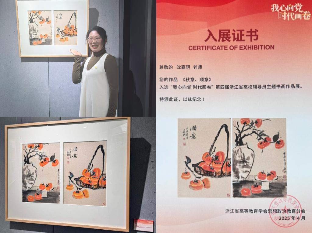 4月25日,“我心向党,时代画卷——第四届浙江省高校辅导员主题书画作品展暨公益拍卖活动”在中国美术学院南山校区拉开帷幕。伟德官网辅导员沈嘉玥的作品《秋意、顺意》入选。