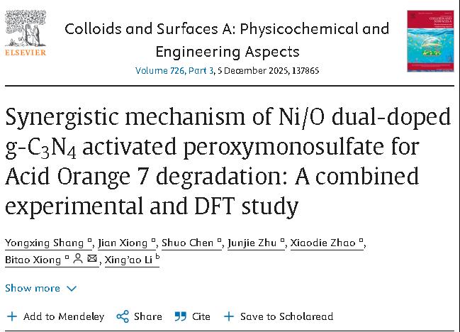 近日,应用物理2022级本科生商永兴以第一作者身份在《Colloids and Surfaces A: Physicochemical and Engineering Aspects》期刊上发表了题为“Synergistic mechanism of Ni/O dual-doped g-C3N4 activated peroxymonosulfate for Acid Orange 7 degradation: A combined experimental and DFT study”(阅读原文)的文章。伟德国际1946bv官网为第一署名单位,应用物理系熊必涛老师为论文通讯作者。