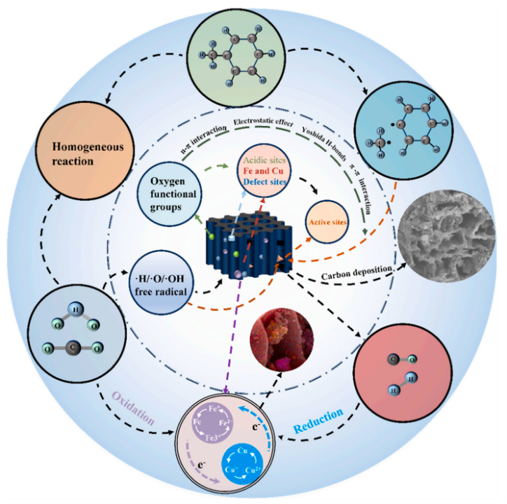 在Journal of Environmental Chemical Engineering上发表的“Efficient hydrogen conversion of toluene via biochar-supported Fe-Cu bimetallic catalyst under CO2-steam synergistic conditions”(点击阅读),硕士研究生张健凯为第一作者,叶超副教授为通讯作者,伟德国际1946bv官网为第一单位。研究结果表明,Fe-Cu双金属的协同效应增强了催化剂金属位点的抗氧化性,降低了反应的活化能,并提高了对碳沉积的抵抗力。该研究为双金属催化剂对甲苯高效氢转化提供了理论基础。