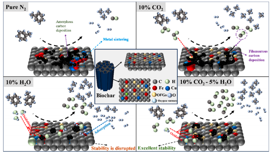 在Journal of the Energy Institute上发表的“ CO2-H2O Synergy Enables Stable Tar Model Compound Reforming over Fe–Cu Biochar Catalyst for Clean Hydrogen Production” (点击阅读),硕士研究生张健凯为第一作者,叶超副教授为通讯作者,伟德国际1946bv官网为第一单位。研究结果表明,10%CO2-5%H2O混合气氛能够有效抑制碳沉积,缓解金属颗粒烧结,防止过度氧化诱导的失活,并协同稳定催化剂表面的含氧官能团。该研究为开发高度稳定的生物质气化系统提供了可行的途径和理论基础。