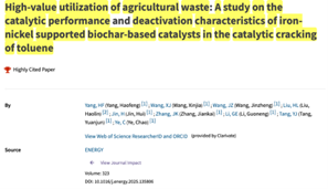 在Energy上发表的“High-value utilization of agricultural waste: A study on the catalytic performance and deactivation characteristics of iron-nickel supported biochar-based catalysts in the catalytic cracking of toluene” (点击阅读),硕士研究生杨豪锋为第一作者,叶超副教授为通讯作者,伟德国际1946bv官网为第一单位。该论文同时入选2025年11月ESI高被引论文。研究结果表明,Fe-Ni催化剂实现了54.01%的最高效率,最大的微孔面积为9.95 m2/g,最低的碳沉积率为3.15%,为生物炭基催化剂的失活机理提供理论支持。