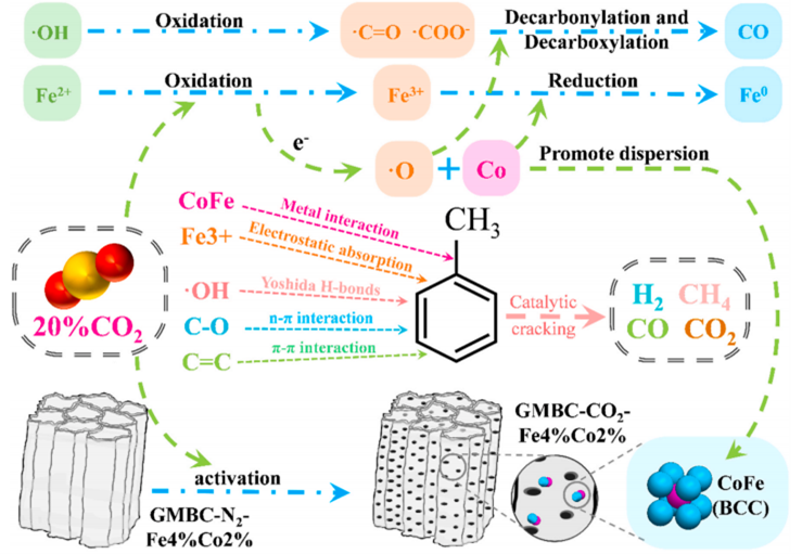 在Journal of Analytical and Applied Pyrolysis上发表的“Synthesis of iron-cobalt-loaded biochar catalyst using CO2-activated goat manure for the enhanced catalytic cracking of toluene”(点击阅读),硕士研究生王鑫佳为第一作者,叶超副教授为通讯作者,伟德国际1946bv官网为第一单位。研究结果表明,20%的二氧化碳气氛增强了催化剂表面金属物种的电子转移,并创造了更多的Fe3+位点。该研究能够减少催化剂制备的原材料和时间成本,同时利用废物去除焦油化合物,减轻了动物糞便和焦油造成的环境污染。