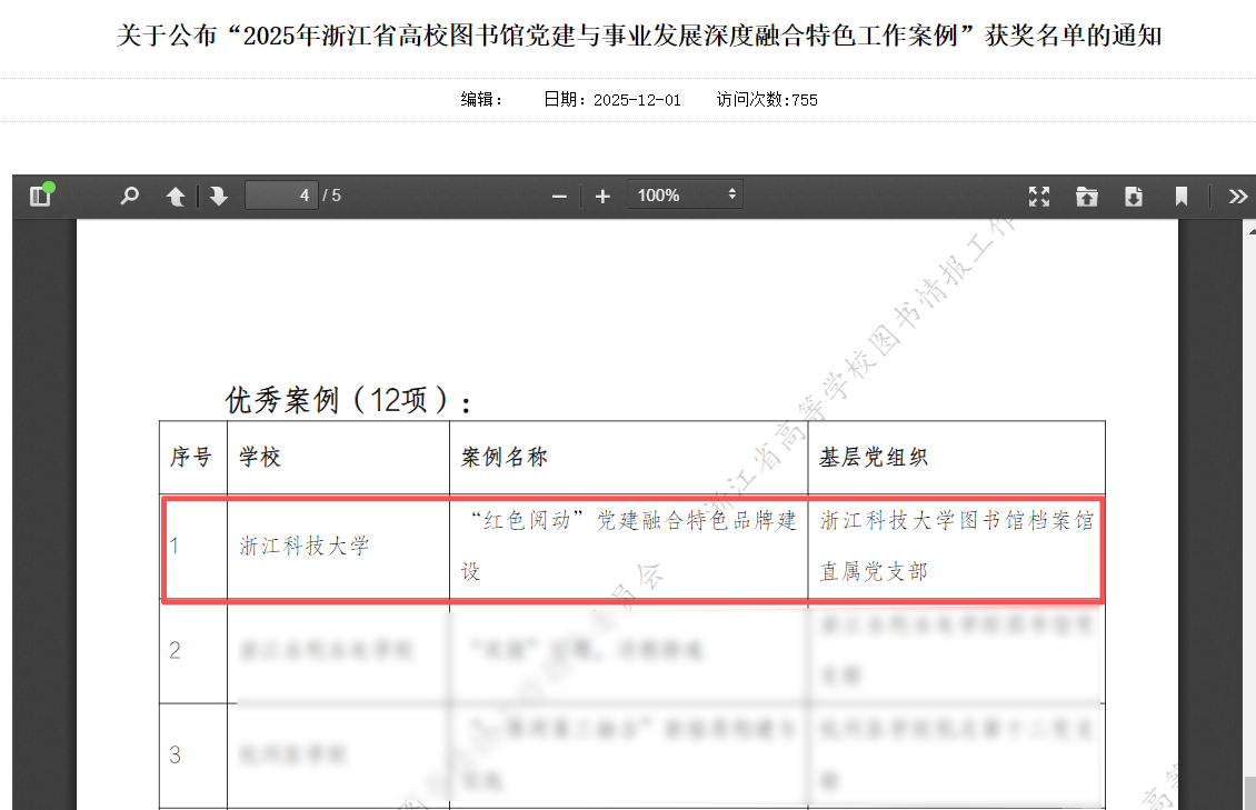 据悉,本次省高校图书馆党建与事业发展深度融合特色工作案例评选在各高校图书馆申报的基础上,经专家评审及省图工委核定,共有28项案例入选获奖名单。下一步,两馆直支将进一步深化“红色阅动”品牌内涵,拓展实施路径,持续推动党建工作与中心工作深度融合。(图书馆 李海娟)