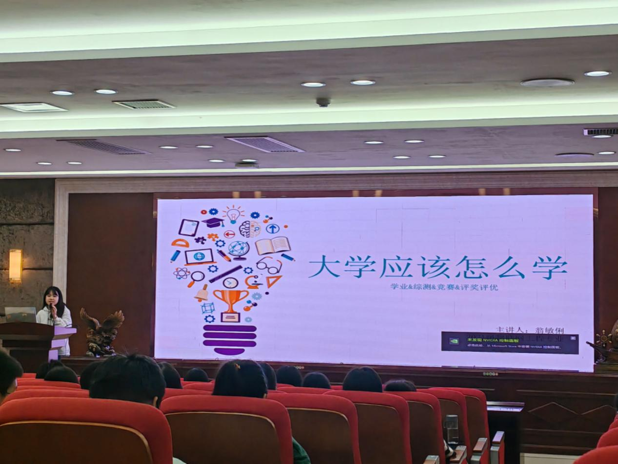 翁敏俐围绕“大学应该怎么学”这一话题,从学习方法、综合测评、学科竞赛、情绪调节四方面进行了讲解。她从自己的亲身经历出发,着重讲解了日常学习和期末复习的方法以及合理安排复习时间的重要性。同时,她介绍了综合测评和学科竞赛的有关事项,为同学们提供了宝贵的经验和建议。除了学习方面,翁敏俐也提到了保持良好心态和情绪的必要性,她希望同学们保持谦虚,拒绝内耗,不要在大学时光中完全放松自己,认真对待这段宝贵的时光。最后,翁敏俐对同学的问题进行了细节上的补充。