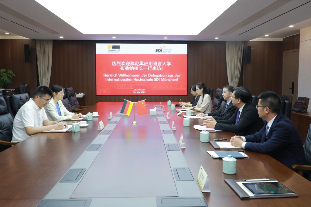 陈建孟对布鲁纳一行首次到访表示欢迎。他介绍了学校的办学总体情况及国际化特色,特别是对德合作情况。陈建孟表示,双方今年已启动德语专业学生交流项目,期待未来在巩固现有合作基础上,不断探索新模式、扩展新领域,联合培养国际化人才。